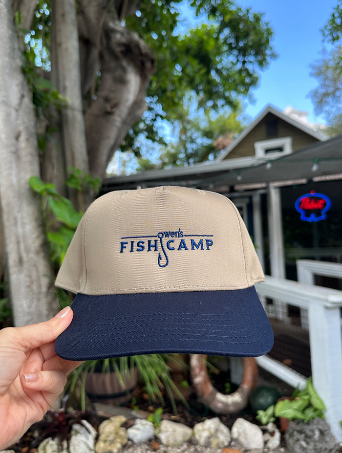 This Owen's Fish Camp hat is perfect for any outdoor adventure. The khaki and navy contrast exudes a classic, rugged look while the adjustable back ensures a comfortable and secure fit. Represent Owen's Fish Camp and stay protected from the sun with this versatile hat.